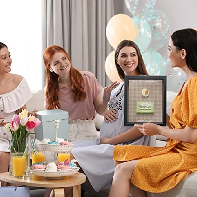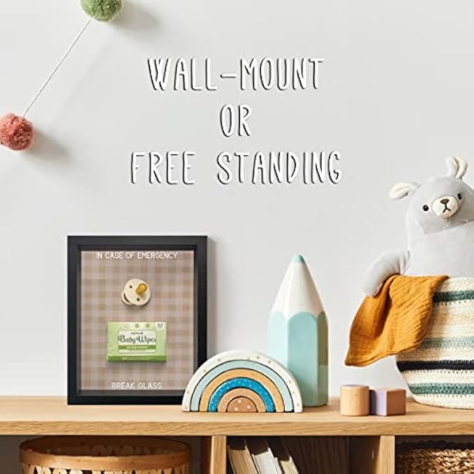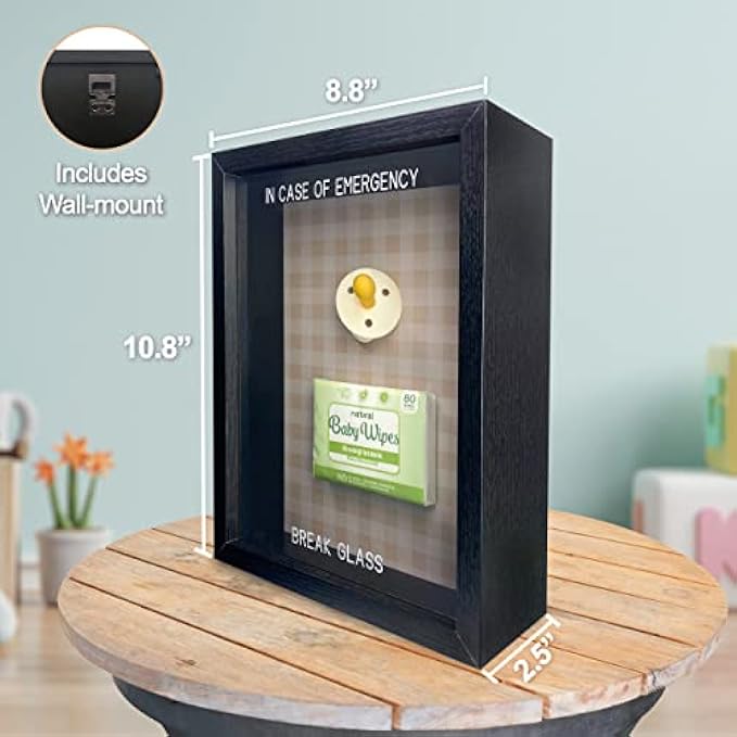 Strong, safe and sturdy: You will not be disappointed with our High Quality mdf laminate frame with our safe plexiglass front, we even printed our in case of emergency break glass frames on the inside to prevent the chance of scratching off the letters. The shadow box overall size is 8.8x10.8x2.5”, Inside is a real pacifier and imitation wipes packet for decoration that makes this a truly unique gift for parents.