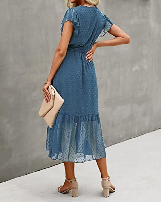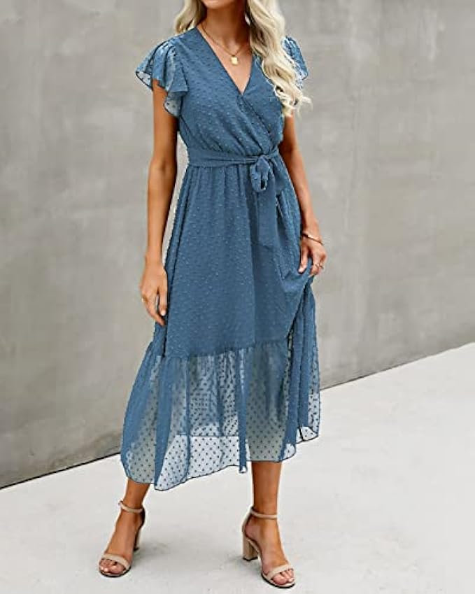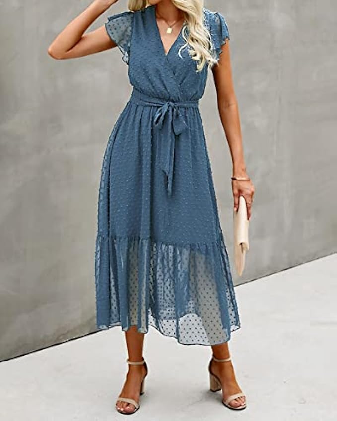 • FEATURE DESIGN - Womens Dresses / Feminine Deep V Neckline / V Neck End With A Safety Button / Simple Solid Color / Cute Ruffle Cap Sleeveless Sleeve Design / Elastic Band At The Waist / Comes With An Extra Belt Of The Same Color, Pattern And Quality / Classic A-Line Silhouette / Flowy Swing Pleated Hem / Romantic Bohemian Style / Comfortable Midi Length / Belong The Knee And Above Ankle Length / Lightweight Soft Breathable Material / Suitable For Spring, Summer, Fall / Size S,M,L,XL