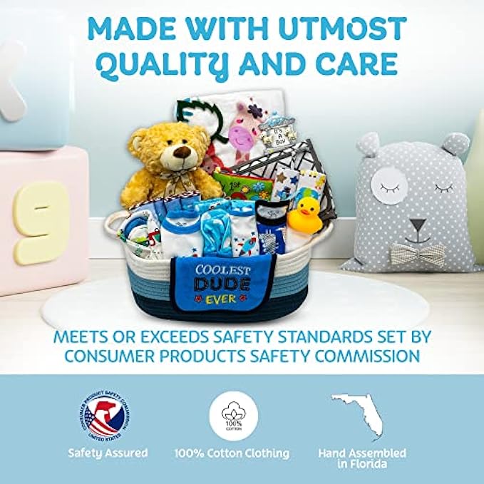 Made with Utmost Care and Quality - Our unique new parent and baby boy shower gift set is carefully sourced and hand-assembled in our Florida factory. All baby items are lab-tested to ensure quality, and they meet or exceed all safety standards set by the Consumer Products Safety Commission.
