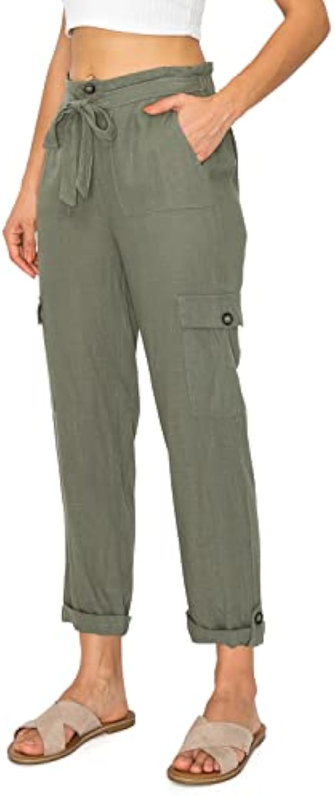Cali1850 Women's Paper Bag Linen Pants – High Waisted Elastic Waistband Self Tie Belt Oceanside Beach Trousers with Pockets