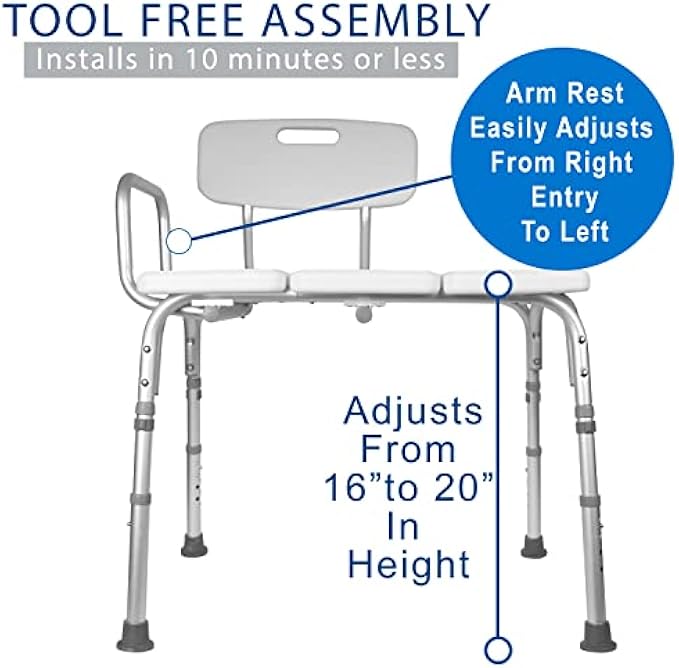ADJUSTABLE SEAT HEIGHT makes it easy to level the bath bench to the perfect height, no tools required. The bath seat (or shower seat) disassembles quickly and easily for storage or travel so you'll never have to leave your comfort at home.