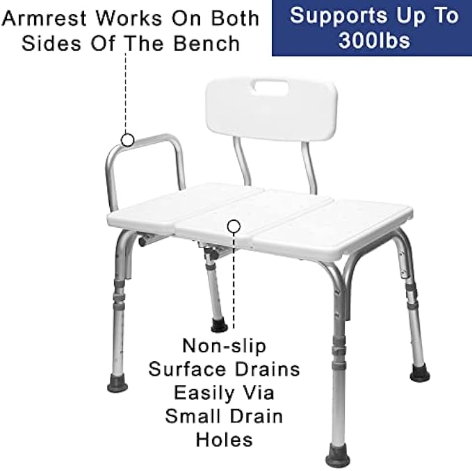 STURDY, HOLDS 300lbs. This tub transfer bench shower chair is compact in size but holds up to 300lbs. Comes standard with over-sized slip-resistant tips for increased stability. Product only weighs 11lbs.