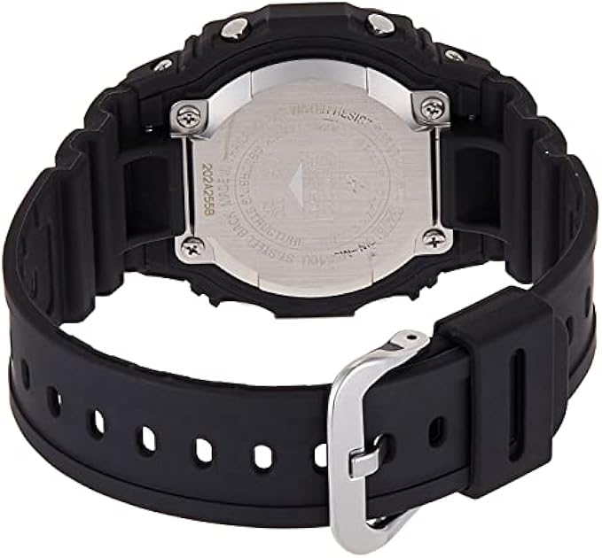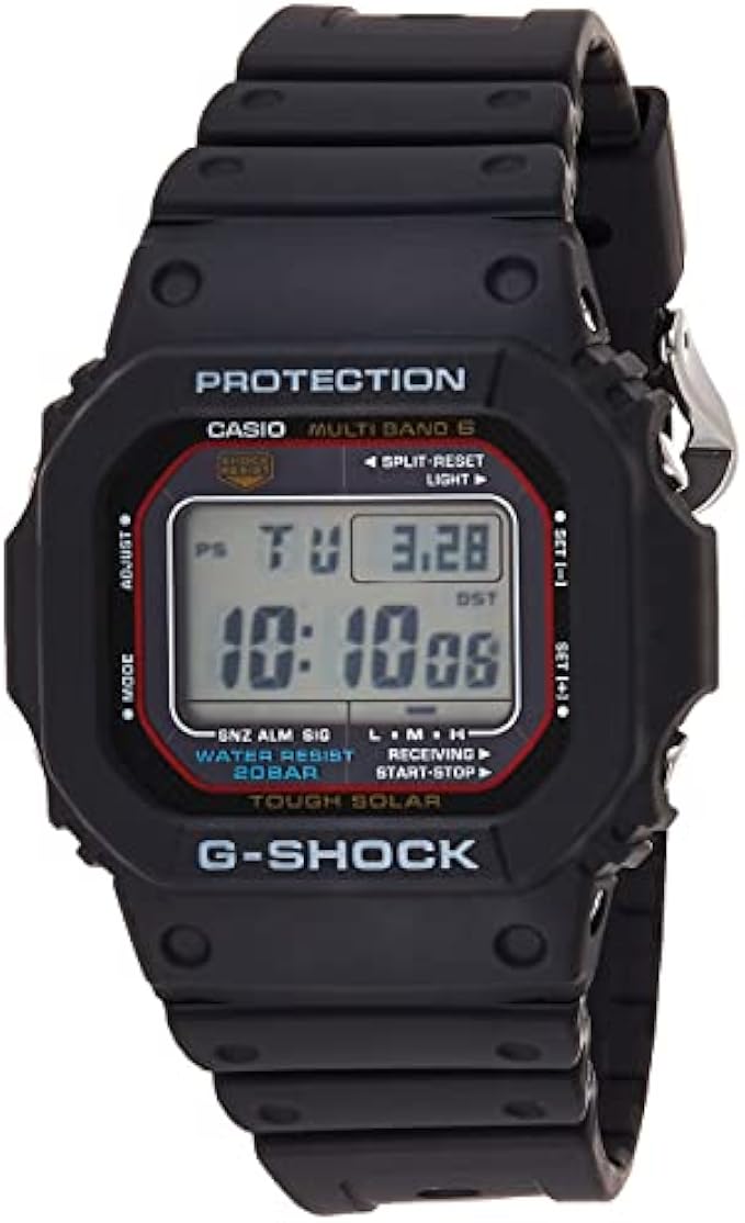 Casual solar-powered watch with multiple functions including multi-band atomic timekeeping, shock resistance, LED backlight, world time (29 time zones, 48 cities), city code display, five daily alarms, 1/100-second stopwatch, countdown timer, full auto-calendar, battery indicator, and power-saving function