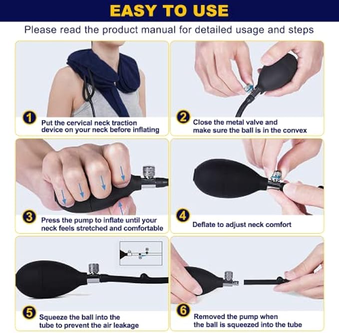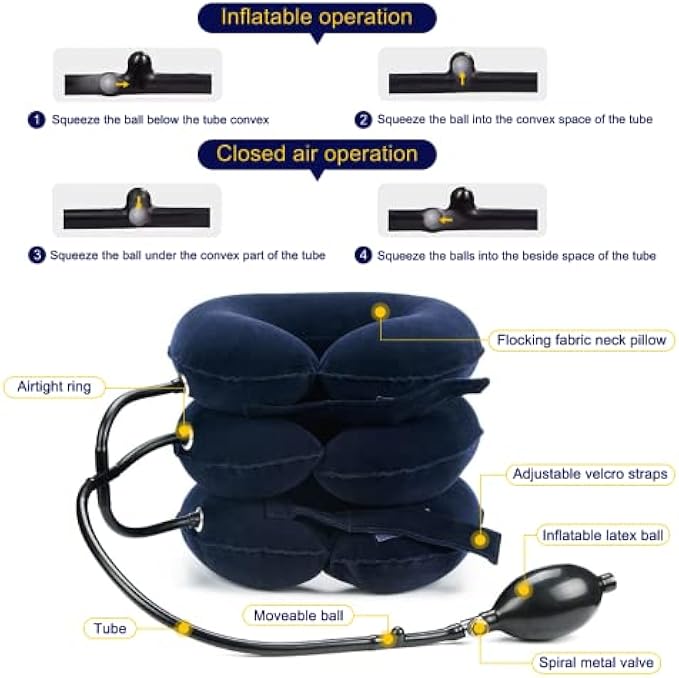 【Triple Leak Protection】 - There are three ways to avoid gas leaks: a ball in the tube, bleed valve, and split three-pipe design. And the neck traction can be inflated at the same time, and the air intake is synchronized. Even with regular use of this neck stretcher cervical traction, no air leaks.