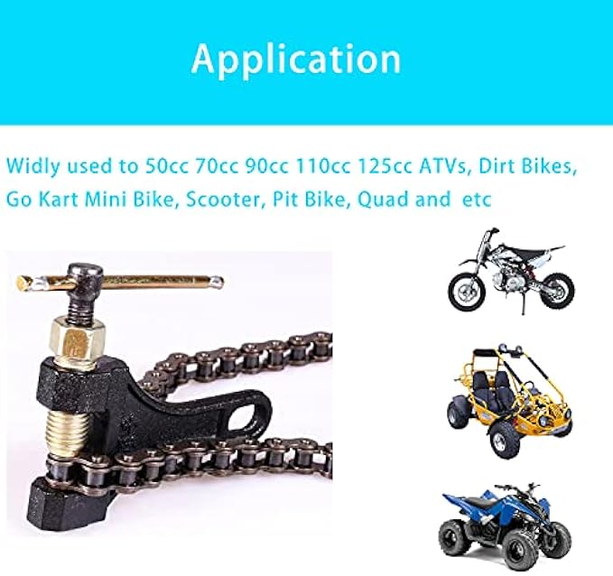 Application: This chain breaker is fit for 420 428 520 525 528 530 roller chains.. It is widely used to adjust the length of a roller chain for 50cc, 70cc, 90cc, 110cc, 125cc ATVs and dirt bikes, GO Kart, Mini bike, Scooter, Pit Bike, Quad and etc