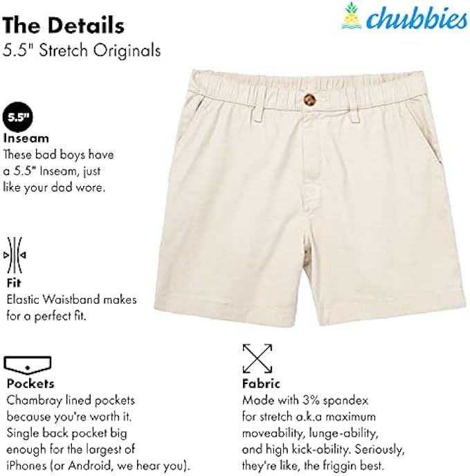 CHUBBIES ORIGINAL CASUAL SHORTS: The Chubbie’s Original Casual cotton shorts feature a 5.5” inseam, elastic waist, ultra-stretch fabric, and an updated fit. These comfortable shorts are perfect for any type of outing: vacation, date-night, boating, golfing, anywhere you need to show off your thighs.