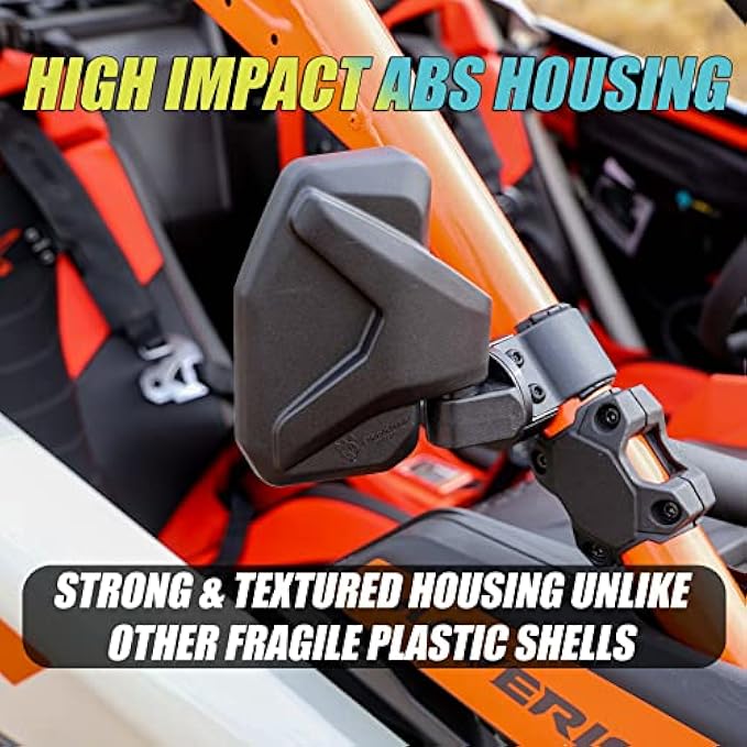✅ HIGH IMPACT ABS HOUSING - offers a full range of adjustability, mirror glass is shatter proof, and tempered for safety. The breakaway glass design with the bevel edges ensures your glass will stay safe, and last for years as your Utv accessories.