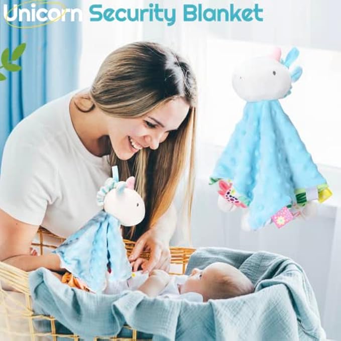 • ?ALL BABY ESSENTIALS?: Baby blanket made of 100% premium plush polyester, double layer, super soft comfortable, lightweight, 30*30inch perfect for newborn baby. Unicorn security blanket is the 1st plush toy for baby boy or girl. Dotted design on both blankets imitate mother's nipples, babies will feel safe by touching. Little socks with cute saying “I’m not crying, I’m ordering dinner.” This baby gifts is ideal for bed using, crib, nap, care, clean and travel.