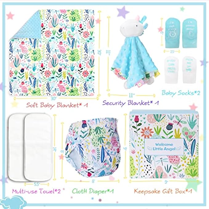 ?BABY SHOWER GIFTS CHOOSING?: This baby shower gifts is ideal trifecta as it’s practical, cute, and personalized. Our baby shower gifts with all practical stuffs are ones your guest of honor can really use when taking caring of new born baby. Unique unicorn bright color design is unique also suitable for baby gifts. Surprise new mom on baby shower! ?9 PACK BABY GIFTS?: The baby gift set will come with 1*cozy blanket, 1*unicorn security blanket, 1*cloth diaper cover, 2*multi-use towels, 2*funny socks, 1*delicate box and 1*greeting card to write message. Unique cute design, superior quality and luxury looking make it a big hit at gender reveal events, baby shower, registry, Easter and Christmas. Lovely newborn baby boy gifts baby girl gifts from grandma/grandpa, aunt, uncle, BFF and etc,. ?ALL BABY ESSENTIALS?: Baby blanket made of 100% premium plush polyester, double layer, super soft comfortable, lightweight, 30*30inch perfect for newborn baby. Unicorn security blanket is the 1st plush toy for baby boy or girl. Dotted design on both blankets imitate mother's nipples, babies will feel safe by touching. Little socks with cute saying “I’m not crying, I’m ordering dinner.” This baby gifts is ideal for bed using, crib, nap, care, clean and travel. ?SAFE MATERIALS?: The most important for baby gift sets is health and safety. So we were strict with material choosing for baby shower gift, used all the highest-quality BPA-free materials, non-toxic, no bad smell, harmless, touch soft, and no allergenic to baby’s skin. No small parts for choking hazard. The cute unicorn security blanket in this baby gift set were made by hand, extremely firm to avoid to be apart. ?100% SATISFACTION?:With same cute garden patterns on box, fleece blanket, unicorn security blanket and cloth diaper, it’s a advanced delicate unified ready-to-go welcome baby gift set. Also a gender neutral baby shower gifts for newborns because of the soft blue color and unicorn theme. For this gifts for baby, baby shower gifts, baby gift set, baby boy gifts, baby girl gifts, if any questions after receiving, please contact us to solve, guarantee your 100% satisfaction.