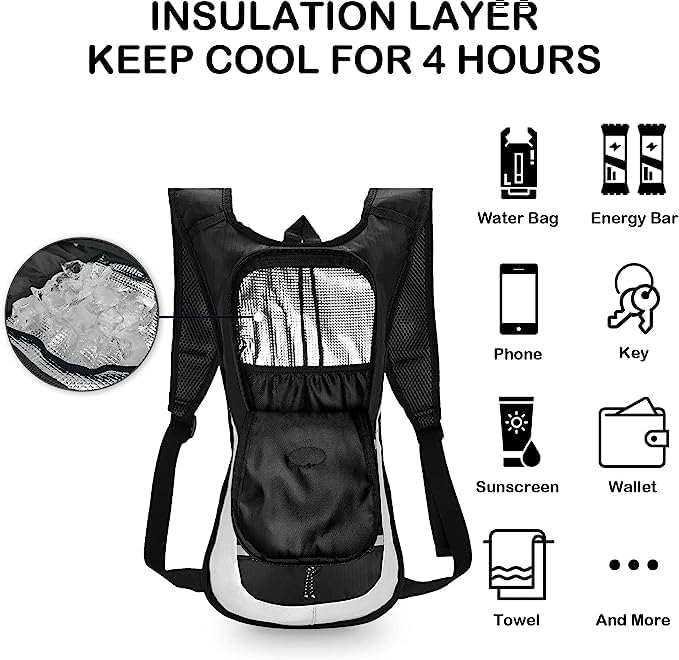 【PERFECT SET】 Included 70-Ounce (2 Liter) food grade hydration bladder, padded shoulder straps, breathable system and lightweight design are the perfect tool for outdoor sports. Perfect small hiking backpack for men, women. 【WATER BACKPACK with 2L HYDRATION BLADDER】 The high quality hydration bladder is made of PEVA material, easy and simple to drink. Just pull the rubber mouth piece out and the water comes right out. Push rubber mouth piece back to close, you don't have to bite anything. 【PERFECT FORM FITTING WATER BACKPACK】 The lightweight cycling backpack has adjustable hipbelt and shoulder straps that can be modified to fit your torso. 2 liters Hydration Bladder. The perfect size offer a nice balance of reasonable weight and bulk while providing a sufficient quantity of water, fit for men, women, and youth. 【FRIENDLY DESIGN】 Reflective trim for night safety, and strap clips to keep extra straps secure. In addition, there's a mesh bag in the front of the bag that allows you to store your mobile phone, towel or any other object for quick access. 【VERSATILITY】 This hydration pack is specially designed for road cycling , running , hiking, compact structure, small size, make your back light and stable, will not produce a lot of wind resistance. It's the ideal choice for men, women for running, ski, cycling biking, hiking climbing, skiing, hunting pouch, music festivals, carnivals, kayaking.