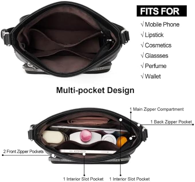 • 【Multi-pocket Design】: Women’s small shoulder purse has 1 Main Zipper Compartment, 2 Front Zipper Pockets, 1 Back Zipper Pocket, 1 Interior Slot Pocket, 1 Interior Zipper Pocket. Maintaining small wallets, mobile phones, keys, sunglasses and other daily small essentials is well organized.