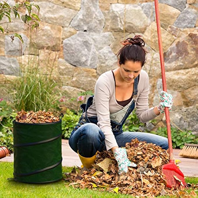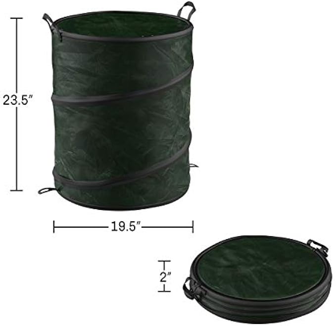 PRODUCT DETAILS – Dimensions: Diameter: 19.5 inches, Height: 23.5 inches. Collapses to 2.5 inches x 19.5 inches. Material: Polypropylene. Size: 33 Gallon. This large receptacle is helpful for tidying up after yard work