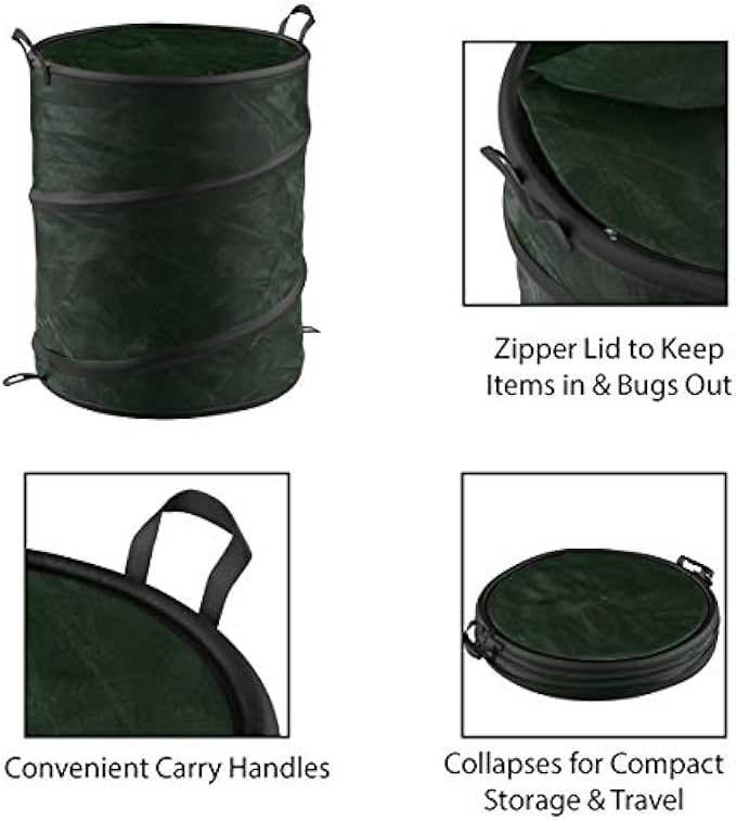 INDOOR OR OUTDOOR USE - This pop up garbage bin can easily be used indoors or outdoors and is an ideal way to reduce your impact on the environment. With the closeable zippered lid, it’s the perfect companion for the outdoorsman for camping, tailgating, backyard bbq’s, picnics, beach trips, cook outs, yard waste, garage recycling and more. Also ideal for indoor parties, craft rooms, laundry rooms or to use for recycling.