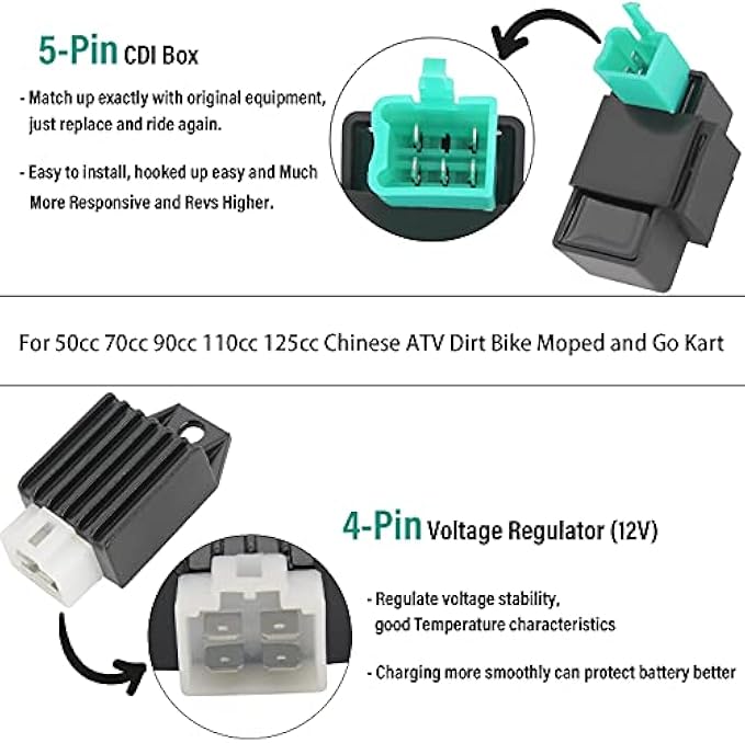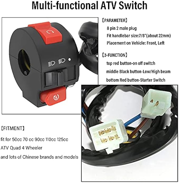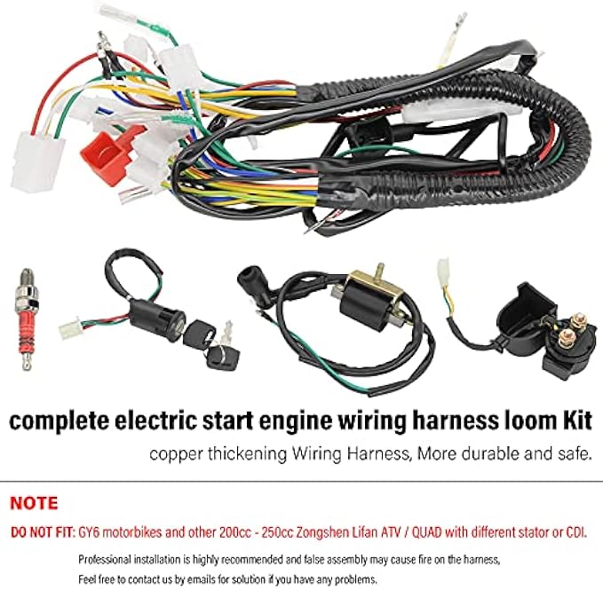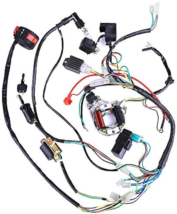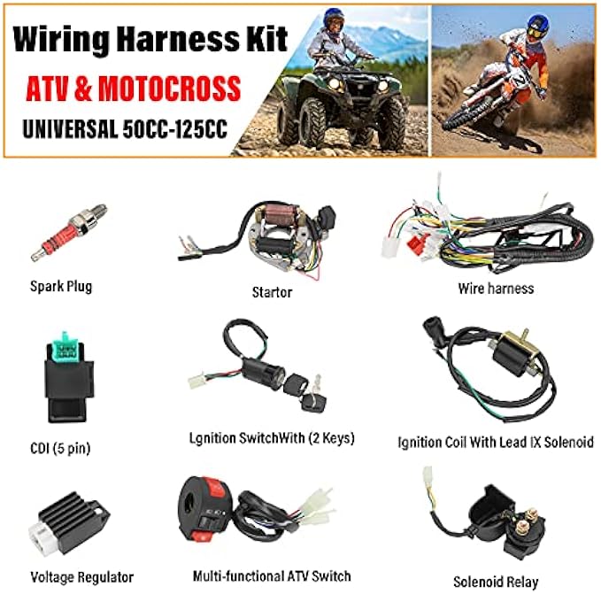 High quality and complete electrics all wiring harness wire loom assembly for QUAD / ATV parts,Complete Electrics Stator Coil CDI Wiring Harness for 4 Stroke ATV KLX 50cc 70cc 110cc 125cc - atv wiring harness ;DO NOT FIT: GY6 motorbikes and other 200cc - 250cc Zongshen Lifan ATV / QUAD with different stator or CDI. Fits almost all years Chinese made electric start upright engine 49cc 50cc 80cc 90cc 100cc 110cc 125cc ATV / QUAD / Dirt Bike / Kawasaki KLX / Coolster / Go Kart / 4 wheelers / Scooter / buggy / Motowork & more Compatible :50CC 70CC 90CC 110CC 125CC ATV MiNI QUAD;atv wiring harness kit,chinese atv wiring harness,complete wiring harness atv,powersports wiring harnesses,50cc scooter wiring harness,110cc chinese atv wiring harness,pit bike wiring harness,110cc atv wiring harness,atv wiring harness,110cc atv wiring,110cc wiring harness,taotao wiring harness,90cc atv wiring harness,gy6 wiring harness,150cc go kart wiring harness This is a complete electric start engine wiring harness loom,include 1x ATV Wire harness,1x CDI(5Pin AC),1x Solenoid Relay,1xRectifier (Voltage Regulator) ,1x Ignition Switch (2 keys, waterproof),1x Upgraded Multi-functional ATV Switch,1x Stator (Magneto Generator),1x Ignition Coil with lead and 1x Spark plug. Please check the pictures carefully before buying, especially the pictures of Magneto Stator. Professional installation is highly recommended and false assembly may cause fire on the harness,though this occasion happens rarely. Feel free to contact us by emails for solution if you have any problems.