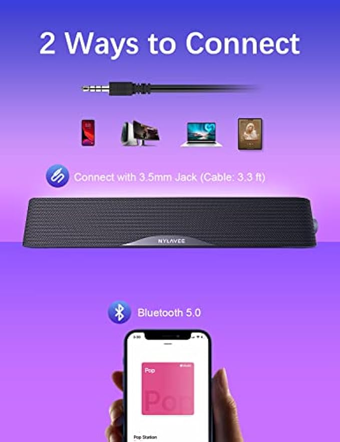 ✅【2 Connection Methods】 There are 2 connection methods of the pc speakers which are Bluetooth and AUX wired connection. Nylavee PC speakers are compatible with laptops, desktops, PCs, phones, tablets, Xbox, PS4 etc.