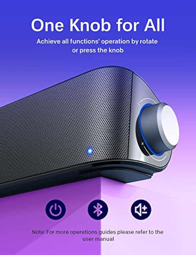 ✅【USB Powered & One-Knob Operation】 Nylavee speakers for pc have no built-in battery, just plug the USB plug into any power source then it will turned on automatically. All functions of the computer soundbar can be operated by the side knob
