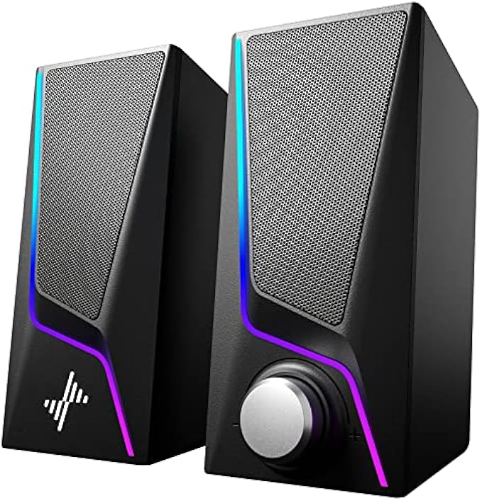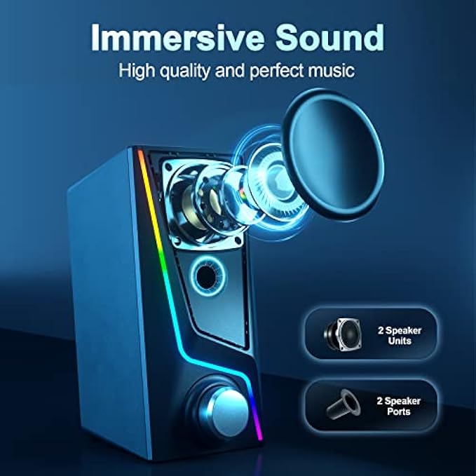 Computer Speakers, PC Speakers with 6 Colorful LED Modes, USB Powered Computer Speakers for Desktop with 2 Bass-Boost Ports, 2 Speaker Units and 3.5mm Aux-in Cable for PC, Laptop, Tablet, Phone