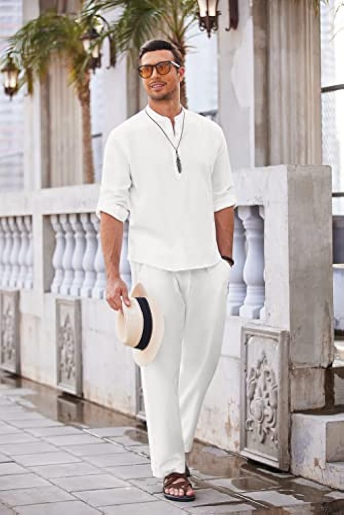 98%cotton 2%Polyester Imported Button closure Machine Wash 【PREMIUM COTTON FABRIC】-- Men's 2 piece cotton linen set are made of great fabric, lightweight, breathable and soft touch, moisture-wicking. This beach linen outfits signals the start of holiday! Make sure add this linen 2 piece outfits to your wardrobe for summer look. 【CASUAL 2 PIECE OUTFITS】-- Men's henley shirts featuring with stand collar, button closure, long sleeve with sleeve tabs, simple style, solid color, slim fit, rounded hem. The cotton beach pants features elastic drawstring waist, two slant pockets and one back pocket perfect for storing phones, sunglasses or gadgets. The simple and classic design makes it never be out of fashion. 【MUILT-MATCHED STYLE】-- These 2 piece summer outfits can be matched with sneakers, sandals for a chic and trendy look. Cotton Linen two piece outfits also can be worn alone. The men’s cotton linen henley shirts can match with shorts, pants, trousers or jeans. The casual loose pants can match with t-shirts, tops, tanks. Simple and classic matching of shirts and pants suits that denotes a relaxed, carefree attitude, which is especially appropriate for summer. 【OCCASIONS】-- The men’s 2 piece shirt and pant sets perfect for daily life, yoga, casual, lounge, sleeping, beach, tropical Hawaiian, vacation, travel, work, home, hip hop, street, etc. Men's linen outfits will also be a good gift for your father, brother, boyfriend, husband, son or other male friends. 【GARMENT CARE】-- The 2 piece beach outfits sets machine washable and easy to maintain. Please check size chart before ordering these men’s beach cotton linen outfits to ensure accurate fitting.