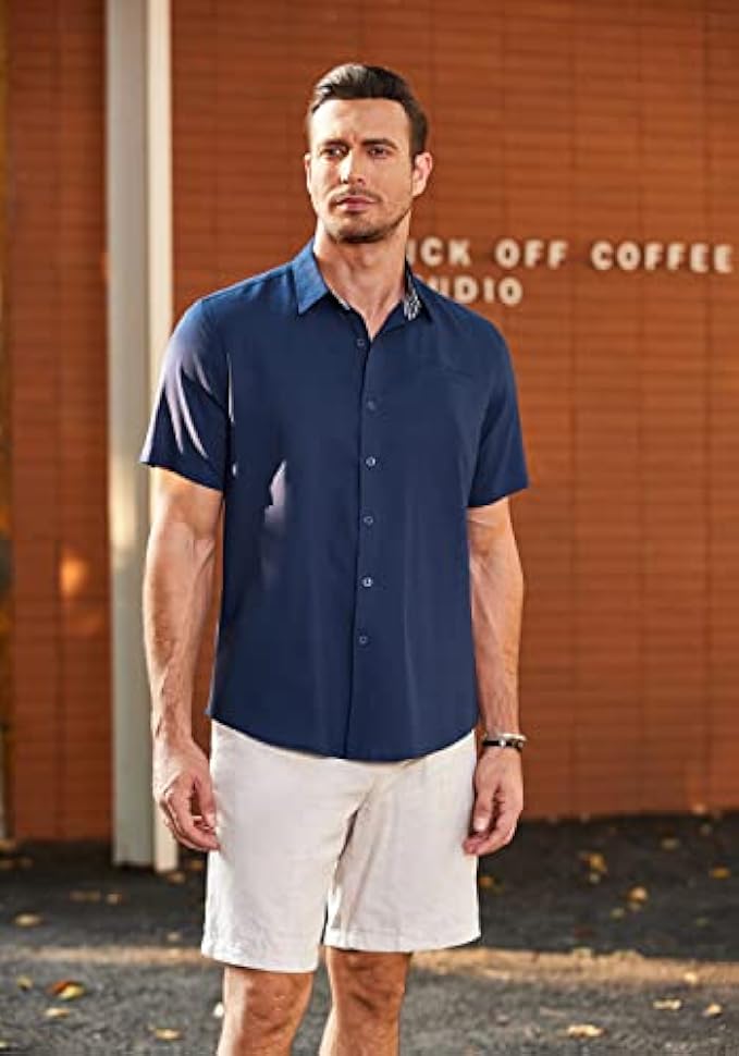 • Basic Design -- Mens beach shirts features short sleeve,button down,checked collar,one Pocket on chest,regular fit.This casual button down shirts are easy to wear and you can't go wrong.