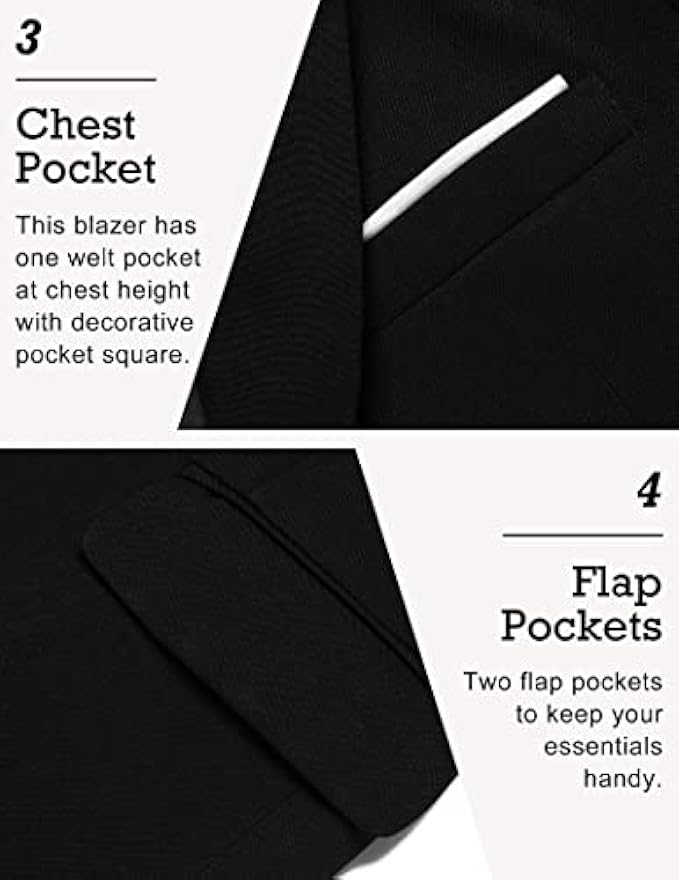 • FUNCTIONAL POCKETS - This mens sport coat featuring two flap pockets and two inside pockets for convenient storage, one welt pocket at chest height for your pocket square.
