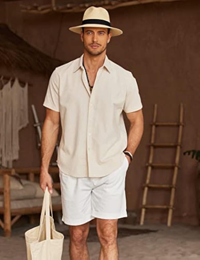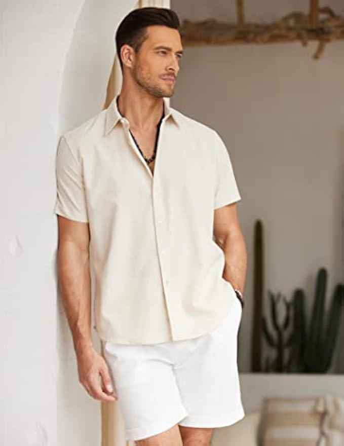 70%Rayon30%Linen Button closure Machine Wash HIGH-QUALITY MATERIAL - Coofandy casual beach shirt is well-made of superior linen and mixture material. Soft, lightweight, breathable, refreshing, stretch, free Wrinkle and no ironing required, perfectly suitable for all seasons. REGULAR-FIT - Coofandy chambray business work shirts features a regular fit for effortless comfort. Short sleeve, button down closure, turn-down collar, solid color. Relaxed, carefree attitude, linen shirt can make you feel cool and comfortable in hot summer. DESIGNER SAYS - Coofandy makes quality clothing that's timeless and simple. Our new 2023 fashion linen short sleeve button up shirt is no exception, which have relaxed silhouettes elevated by causal and simple designs. OCCASIONS - Daily casual, office, school, wedding, camping, travel, yoga, date, beach, party, Men's short sleeve linen button up shirt can match with casual pants, shorts, basic t-shirt…and looks great tucked or untucked. NOTE: Machine wash, cold gentle, drip flat drying in the shade. Please read the size information of the product description to choose your own size before order our trendy short sleeve lightweight linen shirts.