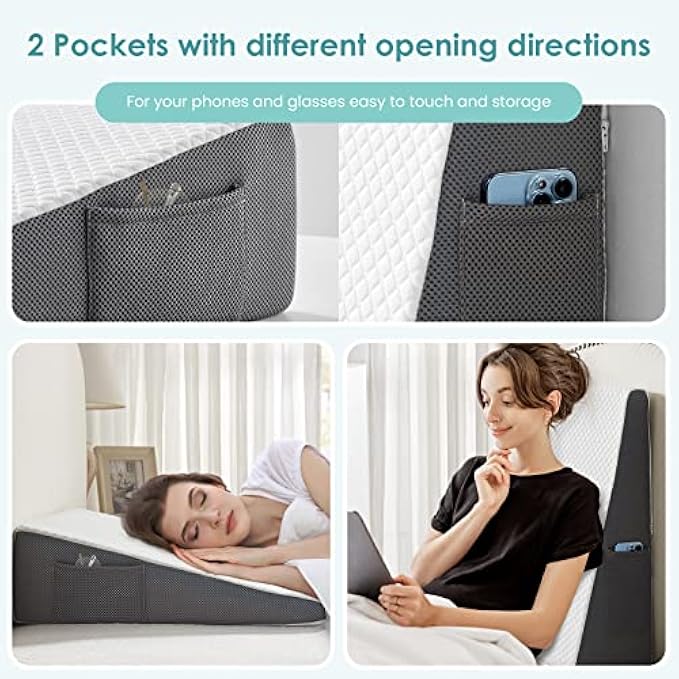 【CERTIFIED BY AUTHORITIES】: Cozymaker Wedge Pillow is certified by CertiPUR-US and Oeko-Tex Standard 100, proving the quality of the product is guaranteed. Very comfortable bed wedge pillow for you and your family to get a good night's sleep! 【UPGRADED ERGONOMIC DESIGN】: Cozymaker wedge pillow combined with upgraded ergonomic design, using 1.2-inch aviation-grade memory foam top and 6.3-inch high-density medical-grade foam core made of the pillow's overall softness and height are very moderate, can relieve pressure on the whole body, can ensure better comfort and suitable support, so that you and your family in the use of it long sleep Not tired. 【APPLICABLE PEOPLE & MULTI-PURPOSE】:Cozymaker Sleep Wedge Pillow is perfect for head/back/knee/leg/foot elevation! Ideal for snoring, after-surgery, GERD, heartburn, acid reflux, bloating, migraines, congestion, swollen legs or neck & back pain, and other medical conditions, the Cozymaker Wedge Pillow helps relieve these symptoms once and for all. Flip the sleep wedge pillow vertically to read, listen to music, watch videos, play games in a comfortable seated position on the bed, couch or floor, or even take these cushions outside to relax. So it is also suitable for many scenarios in which you can make your life more comfortable and better. 【SOFT & SKIN-FRIENDLY COVER】:Cozymaker wedge pillow surface is made of soft and skin-friendly bamboo fabric, which can quickly absorb body heat and immediately reduce skin temperature by 2 to 5°C. The 3D breathable mesh fabric on the side of allows heat to escape and fresh air to circulate in. So you can enjoy a cool, dry and comfortable sleep without feeling sweaty; it also features 2 special pockets on each side with different opening directions to easily fit items such as glasses, remote controls or cell phones. The bottom and back feature non-slip spots to make you sleep more comfortably and securely. Its cover is removable and washable, its insert (memory foam + foam) is not washable. 【 CUSTOMER SERVICE & IMPORTANT NOTE】: We offer 30 days return/exchange service for 100% satisfaction, contact our customer service through Amazon when needed. If you encounter a small probability event and receive a defective wedge pillow, contact us promptly, we are willing to send you a new one for free without sending the old one back. Note: We use in the product packaging in line with international standards compression ratio of it compression, open the box in the air exposure for 48 hours the product can be restored intact, there will not be a long time still can not be restored, if you unpacked feel the product did not recover, be sure to wait for it 48 hours, it will surprise you.