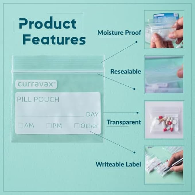 CURRAVAX Pill Bags Pack of 500 - BPA Free 3 x 2.75 inch Pill Pouch - Reusable Pill Pouches for Medicine with Write on Label –Clear Ziplock Pill Baggies for Travel Medicine Organizer
