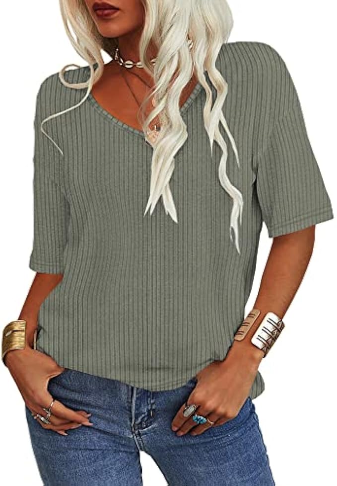 Danedvi Women Summer Casual V-Neck Half Sleeves Ribbed T Shirt Solid Loose Basic Tunic Tops