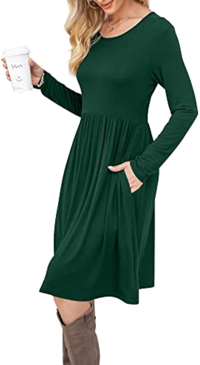 • Features: Round neck, Long sleeve, elastic waist and pockets. This dress is light and casual, There is an elastic band at the waist seam.