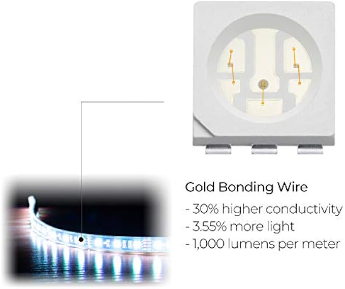 ➤Maximum Brightness: LEDs with gold bonding wires – 30% higher electrical conductivity, 3.55% more light than the cost-effective material copper; 60 LEDs per meter, up to 1,000 Lumens per meter.