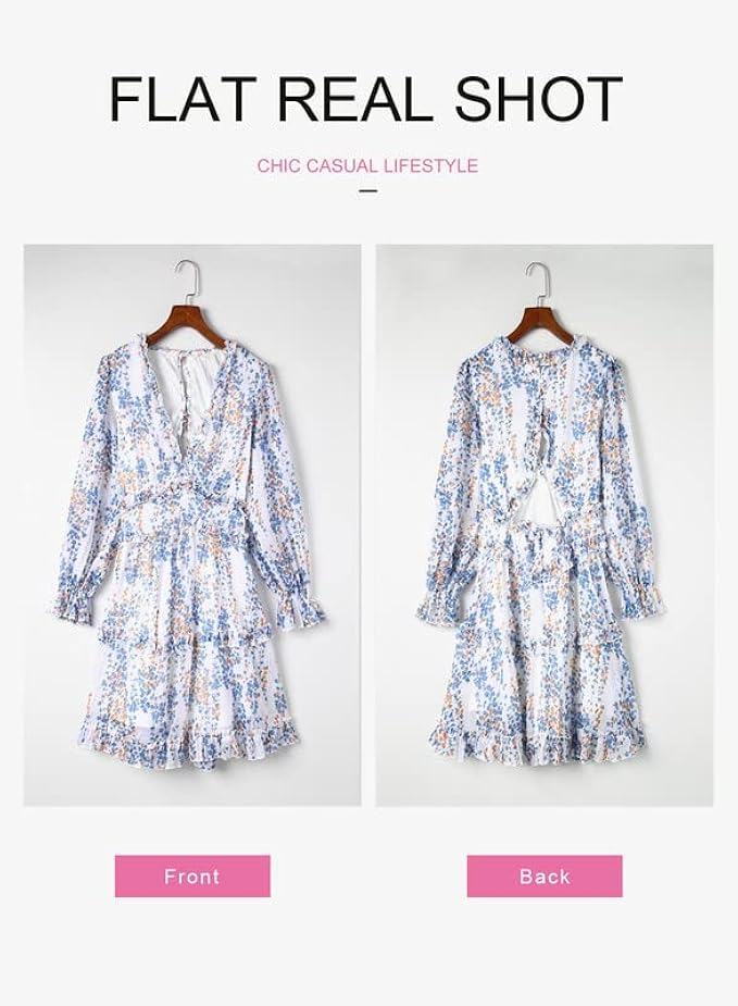 Dokotoo Womens 2023 Spring Summer Deep V Neck Ruffle Long Sleeve Floral Print Mini Dress