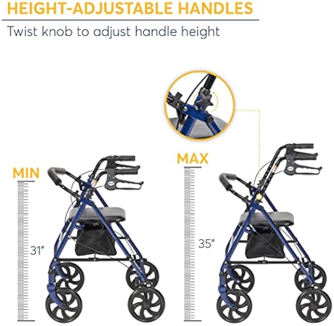 Adjustable Components: Easy-turn lever allows you to quickly adjust the height of the handles from 31 to 35 inches; our walker with wheels includes a removable hinged backrest that can be folded up or down