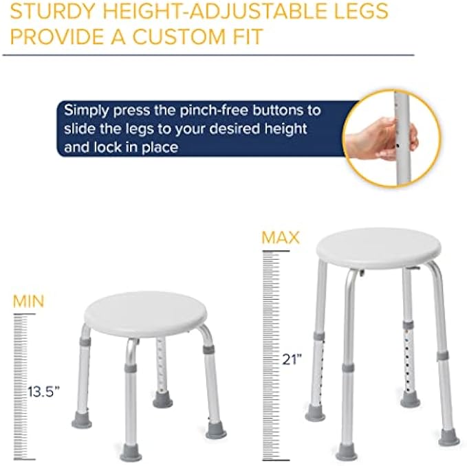 Secure and Scratchproof: Our bath seat for bathtubs and showers comes equipped with support collars which limit leg movement, reduce rattles, and offer pinch-free cover for the push pins, allowing easy adjustment