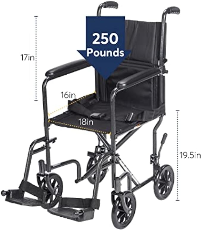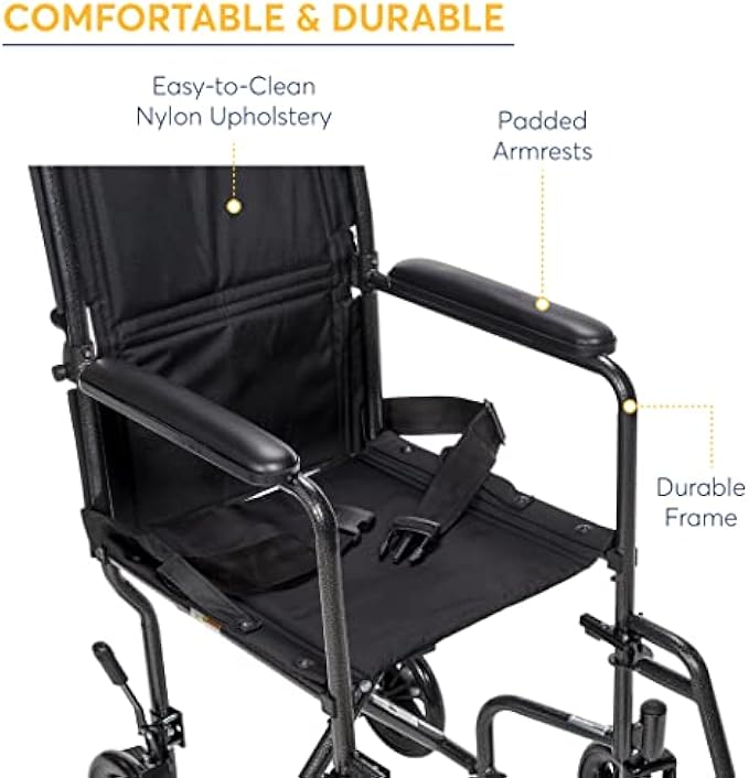 Comfortable and Easy to Clean: This ultralight transport chair comes equipped with a 17-inch easy-to-clean padded nylon seat designed to provide lasting comfort
