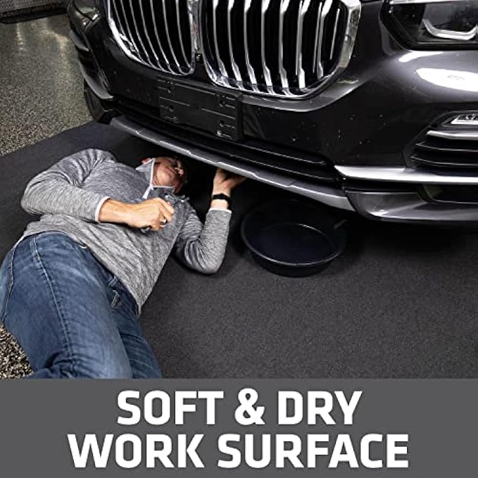 WATERPROOF BACKING, SLIP-RESISTANT: The waterproof layer stops motor oil, brake fluid, gasoline, coolant, and prevents these liquids from soaking through to damage or stain the surface below. The slip-resistant backing helps keep the mat in place.