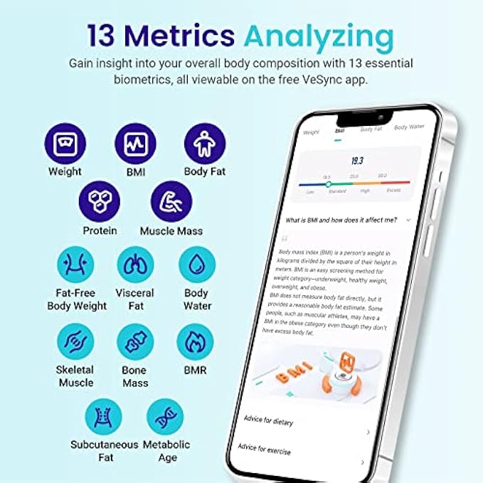 Weigh Smarter: Beyond analyzing 13 biometrics, setting goals, and viewing progress graphs, our scale offers even more intelligence. Connect the app to Alexa for hands-free voice control and quick answers. Rest assured, VeSync prioritizes your privacy