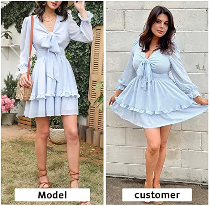 Tie closure Lightweight, flowy and comfy. A good choice for summer and autumn wardrobe. Feature: tie front, deep V neck, ruffles trim, smocked waist, elastic high waist, floral print, balloon sleeve, long sleeve, pleated, makes you elegant and stylish when you wearing it. Design: Boho short dress with deep v neck and tiered ruffle hem design, sexy and sweet style. Plunging neckline with an adjustable tie front shows the body curvy. Elastic pleated waist makes you look slim yet loose fit and comfy, a must-have dress for girl and women. Occasion: Never out of fashion patterned combines with tie front tiered ruffle layer floral balloon sleeve dress style. Perfect short length, it is above knee length, appropriately show your beautiful legs but not too much, that makes this causal dress is suitable for various places- formal, dating, wedding, birthday, cocktail, party, club, dinner, night out, beach, vacation, holiday, and daily wear. Wash recommended with cold water/Do not bleach/Hang or line dry/Wash with like colors, that will increase the durability of your clothes.
