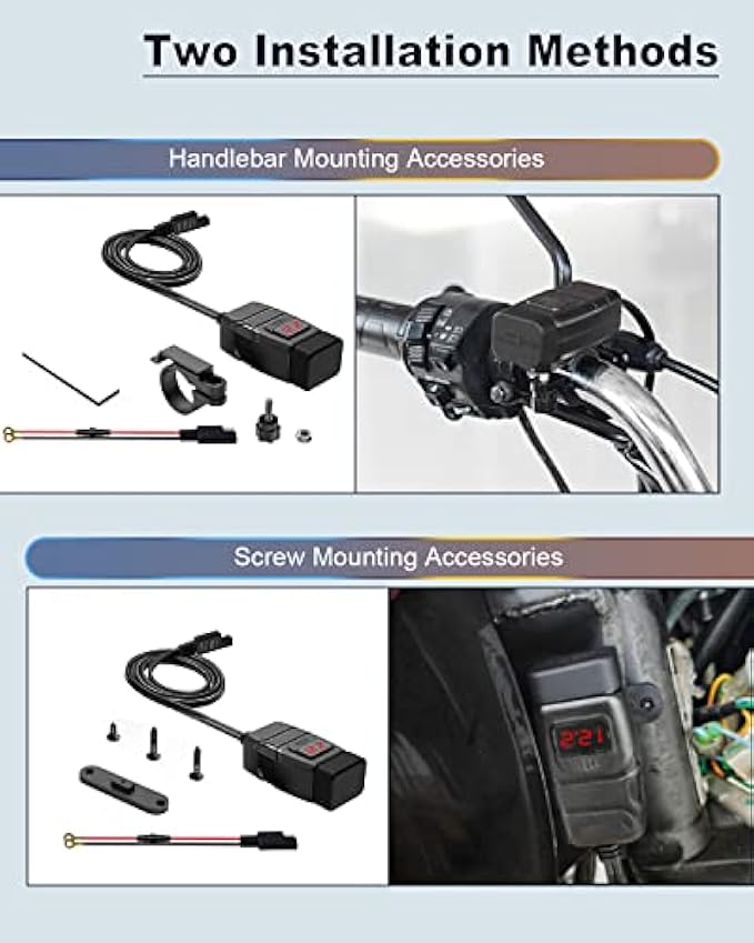 LED Voltmeter & ON/OFF Switch - The motorcycle charger has an independent switch button and an on/off switch, so you will know the battery's health while driving. Monitories the battery and electrical system automatically and indicate the voltage on the screen, to avoid power consumption, easy to use. (TIPS: Please replace the battery as soon as possible if the voltage is lower than 12V)