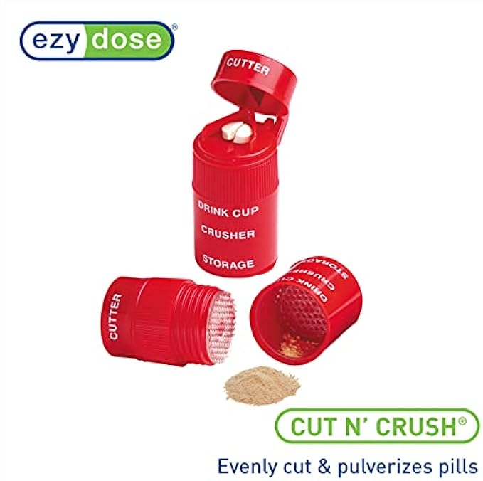 Ezy Dose Pill Crusher, Cutter and Grinder, Crushes Pills, Vitamins, Tablets, Stainless Steel Blade, Removable Drinking Cup, Red