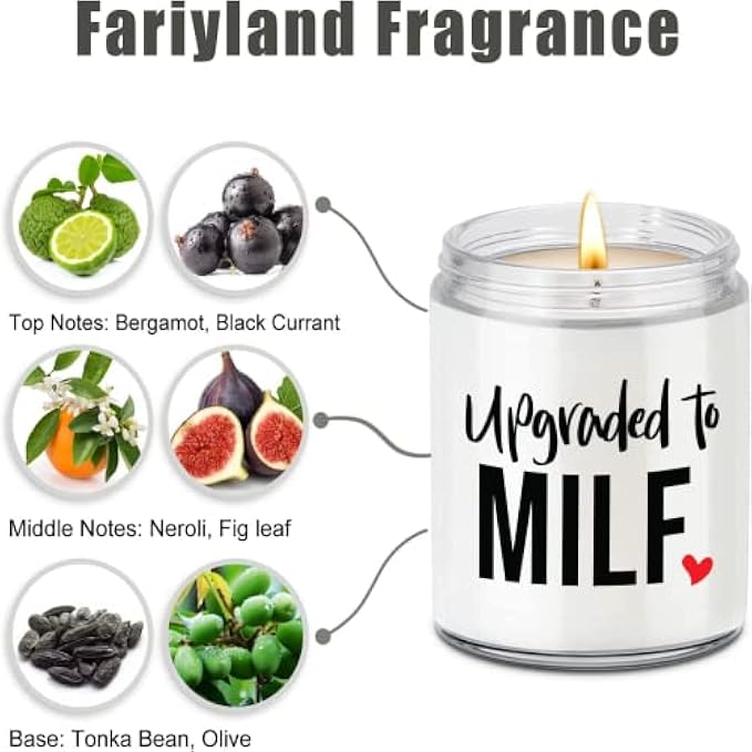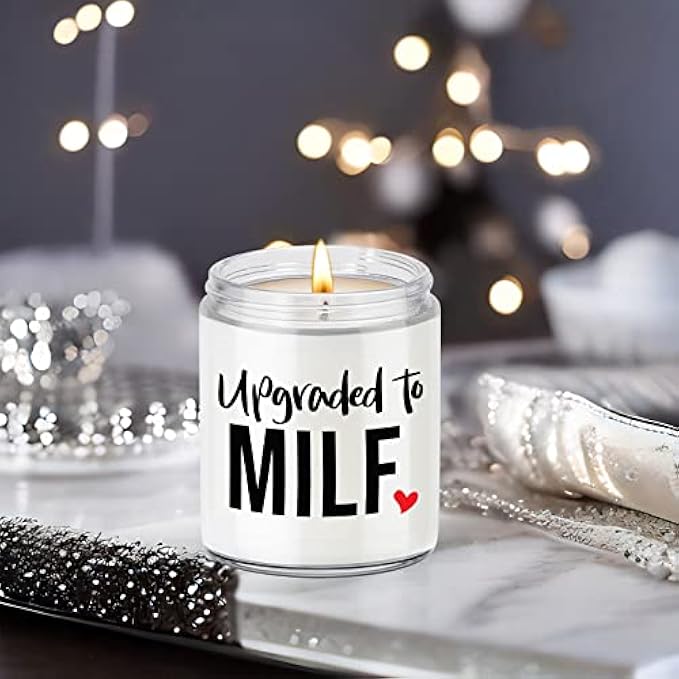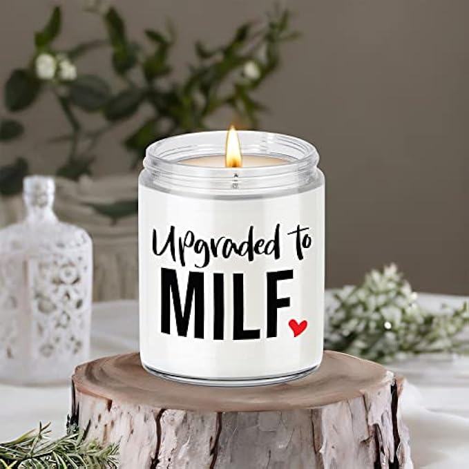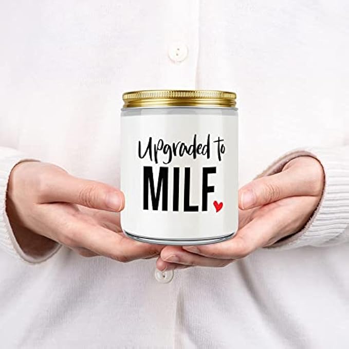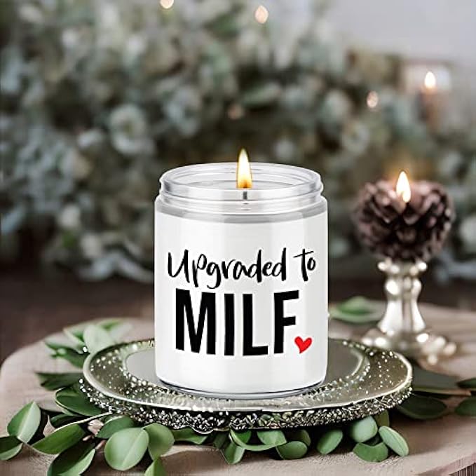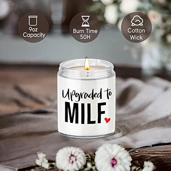 New mom gifts; With saying "Upgraded To Milf", this pregnancy candle makes a great hilarious gift for new mom, first time mom, pregnant mom, expecting mom, pregnant friend, pregnant wife, soon to be mom, new mother, mother to be; Fun gifts for pregnant women mom to be Pregnant candle gifts idea for many occasions; Perfect for first mothers day gifts, expecting mothers day gifts, pregnancy gifts for first time moms, baby shower gifts for mom, first pregnancy gifts for mom, newly pregnant gifts, push presents for new mom, gender reveal gift, funny new mom gifts for women after birth More different premium scents to choose from: congrats, fairyland, lavender; Infused with warm glow and enchanting fragrance, our congrats scented candle is a perfect way to say congratulations; Radiates with notes of crisp floral scent, blended with a touch of refreshing herbal aroma, the lavender fragrance adds enjoyment to your life; Fairyland scented candle has blended with refreshing rounded bergamot and black currant, sweet candy aromatic neroli and fig leaf, mild tonka bean, and olive 100% soy wax & cotton wick; Made from natural soy wax, our soy candle burns evenly and clean; Perfect for your home, bedroom, kitchen, bathroom, living room, office and so on Burns for 50 hours; 9 ounces scented candles; Well protection with inner sponge mat
