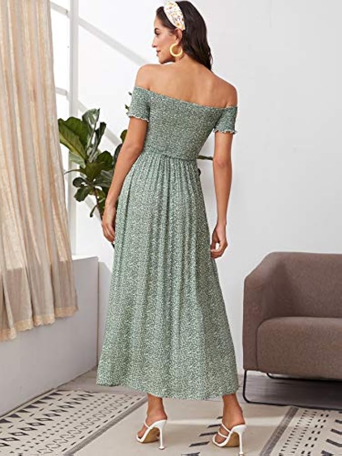 Floerns Women's Boho Floral Print Off Shoulder Split Long A Line Dress