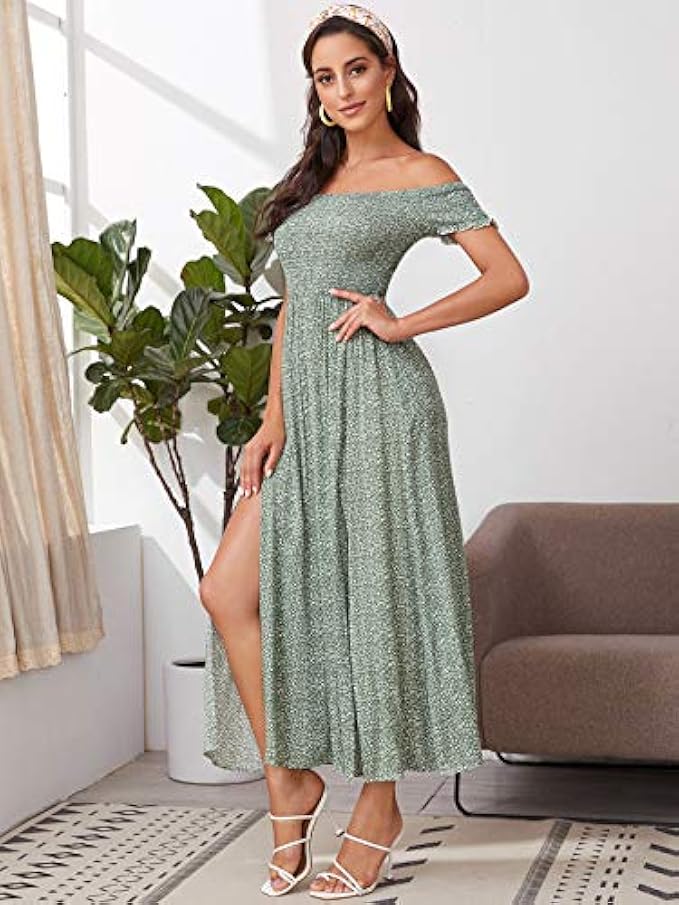 Floerns Women's Boho Floral Print Off Shoulder Split Long A Line Dress