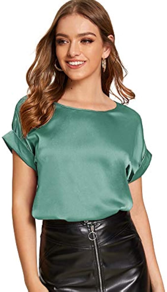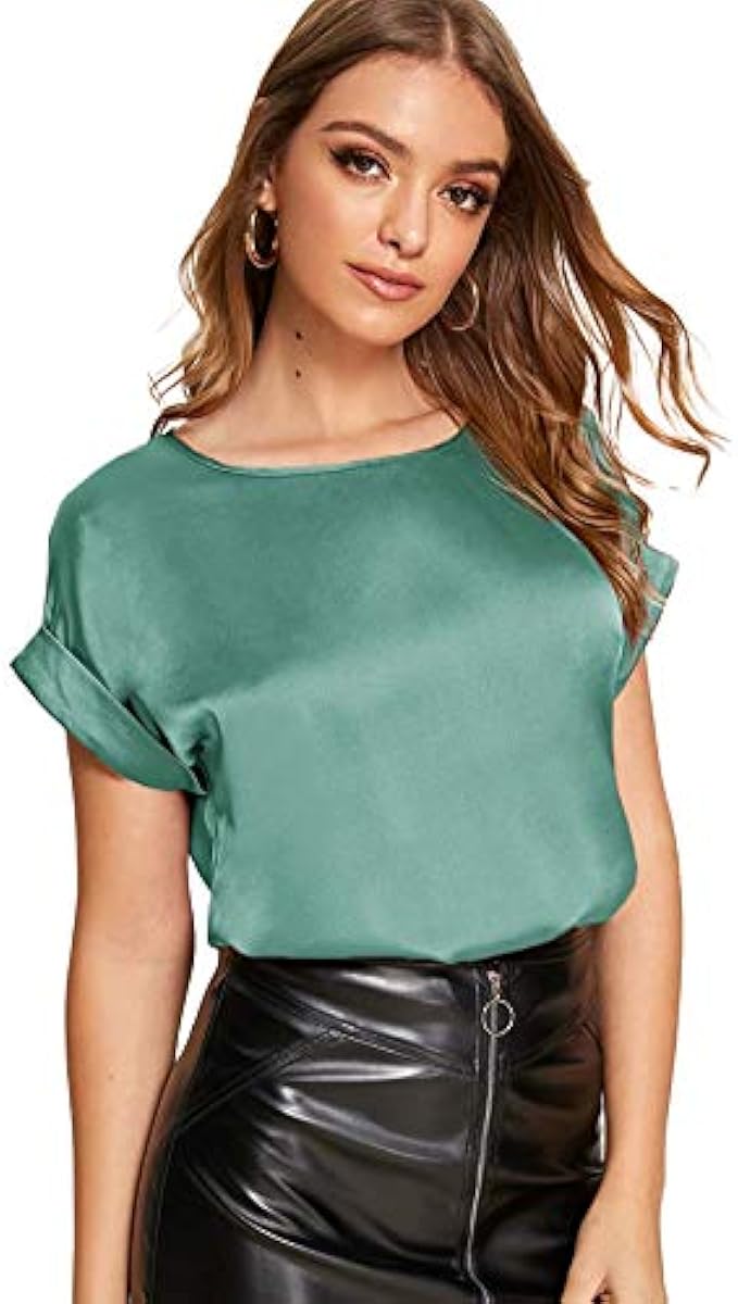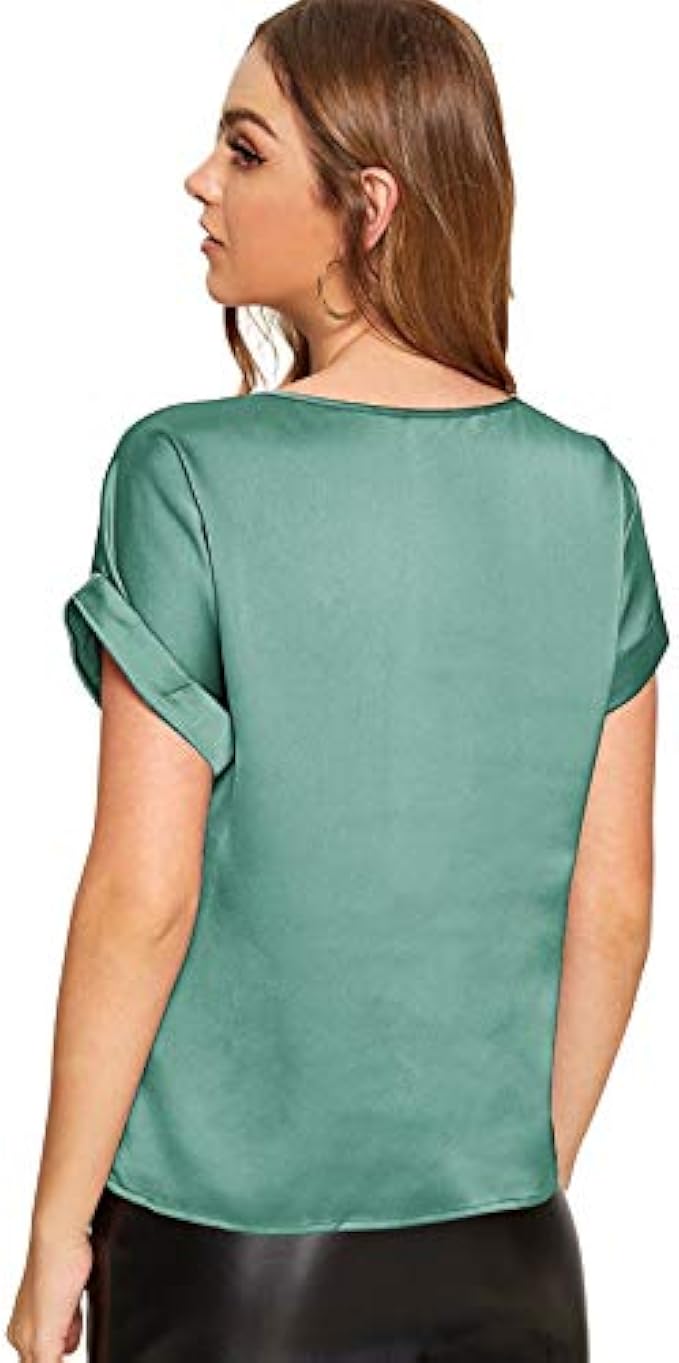 Floerns Women's Elegant Round Neck Rolled Short Sleeve Satin Silk Blouse Tops