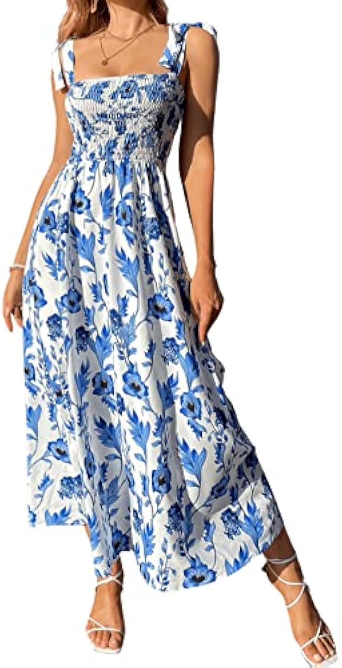 Floerns Women's Floral Print Tie Strap Square Neck Ruffle Boho Maxi Dress