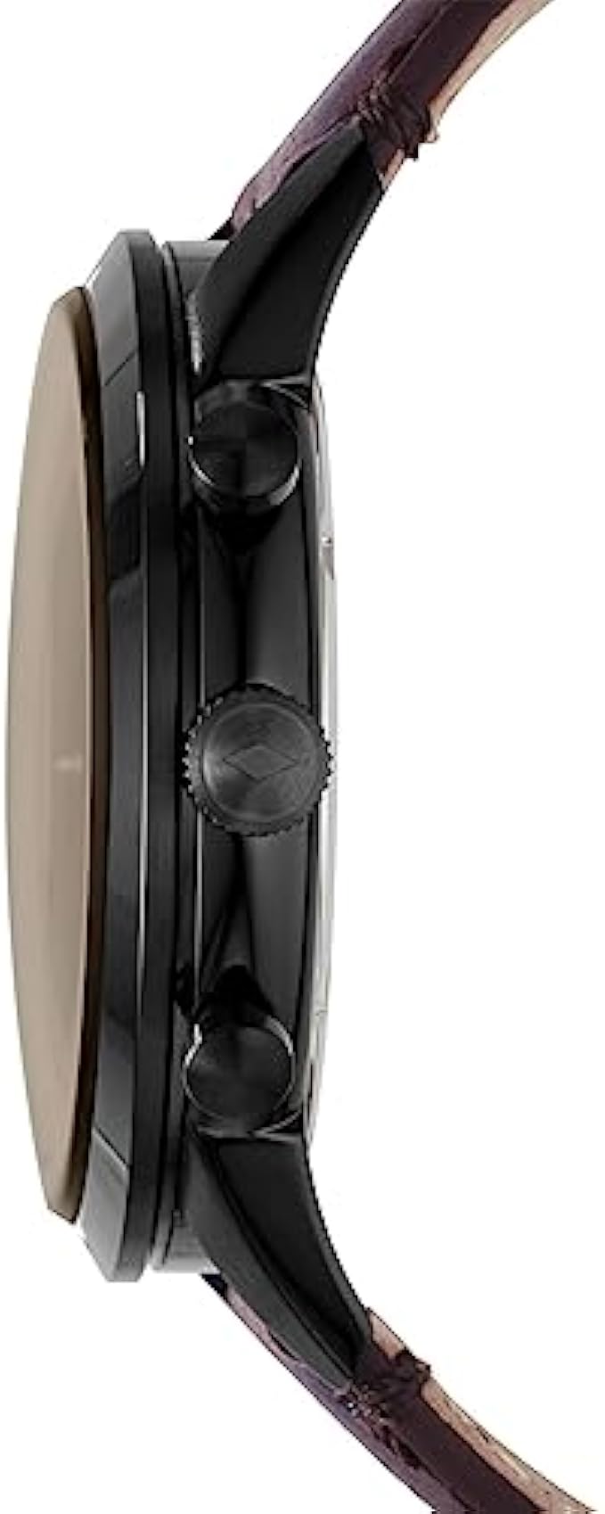 Black stainless steel case with black dial; genuine dark brown leather band with adjustable buckle closure; interchangeable with all 22mm Fossil watch straps