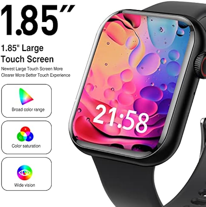 • ✅【1.85 inch screen and DIY dial】This smartwatch is equipped with 1.85 inch full touch color screen with excellent picture quality and smoother use. This men and women smartwatch supports multiple languages, fitness tracking software "Coolwear" can update the clock face, view more beautiful clock faces at "Coolwear", and the watch wallpaper can be DIY, connect your phone and design your own unique style.