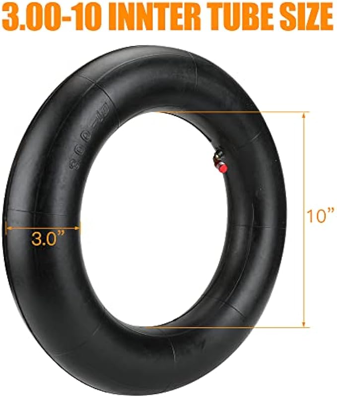 Inner Tube 3.00-10 with Bent Valve Stem, Compatible with a 10" rim, Depending on the manufacturer, this inner tube’s size may be listed as :2.50-10 | 2.50x10 | 2.75-10 | 2.75x10 | 3.00-10 | 3.00x10 | 80/100-10 | 100/80-10,80/90-10 | 90/80-10 | 90/90-10, please check for the details and size to make sure this part will fit. Inner tube Replacement for : Dirt Pit Bike Scooters Moped,Such As Chinese Made Brands SSR,YCF,IMR,Atomik,Thumpstar,BSE,Apollo,Kayo,Stomp,Piranha,DHZ,GPX,Pitster Pro,SDG,Braaap,Lifan,YX following compatible models for reference:Honda XR50 XR50R XR70 CRF50 CT70 EZ90 Cub | Razor MX650 / MX500 (Back Tire) | Suzuki DRZ70 / JR50 | Yamaha PW50, | Motovox MVX70 | Coolster QG-214X-W125 ,Coolster QG-214XR-2 | Razor RSF650 Electric Sport Bike Made From Premium Rubber and Built To Last: Made with premium-quality, heavy-duty rubber, these inner tubes are highly durable and ideal for home, professional and commercial / industrial use Package Include:2 X Inner Tube,2 X Red Stem Valve caps,2 X Black Stem Valve caps,1X valve core wrench,5 X brass Valve Stem Cores