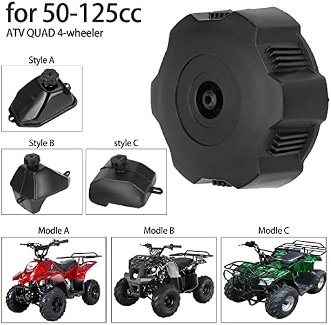 【Fitment】:for 50cc-125cc ATV,and other chinese brand,Such as Roketa, Yamoto, Sunl, Jetmoto, Alpine, JCL, Peace, Coolster,Apollo,RPS,Vitacci Rider ,ICEbear , Tao Tao, kazuma ,KAYO,Lifan, Buyang ,Electra,Coolsport,Baja,AIM-EX,Panther,Redcat,Kangdi, MDI,Eagle,and etc. 【Fitment】known for models:Baja WD50 BA50, TaoTao ATA-110B 110D 125A 125D 125G 125H 135D Boulder B1 110B, Coolster 3050C 3125R 3050D 3125X R8, Apollo Focus 125cc, Vitacci Hawk Kids 110cc, Vitacci Rider 7 9125cc, PROMOTIE Mega -SPYDER 125cc, 125cc Nitro-Motors, kxd 125cc Roti, NITRO Grizzly 125cc/toronto 3g8, RPS 110cc Raider 6/Raider 7 Spartan 007 125CC, Hercules Torino 125cc, UCM Thor 125cc, Veloz -06 110cc Kids, Quad Bamboo 110cc, Vendo cuatrimoto 110CC, ICEbear 110cc . 【Material】Made of ABS plastic , good sealing, do not worry about the oil leakage from the fuel tank 【Size】Inside Diameter: 40mm (1.57 inch), Length : 59 mm / (2.32 inch), Width : 59 mm / (2.32 inch), height : 21 mm / (0.83 inch). 【Package Contents:】1 x Gas Tank Cap,1 X Gas Tank Cap vent breather tube