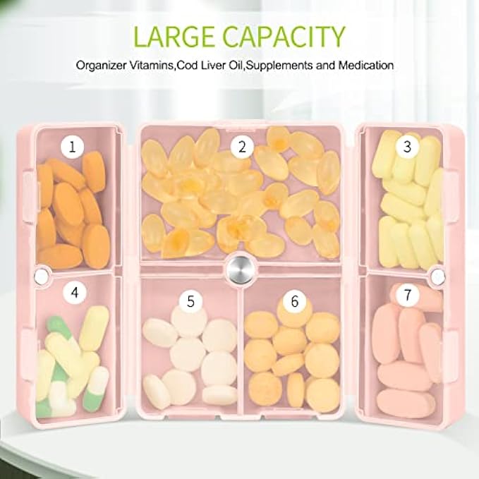 FYY Daily Pill Organizer, 7 Compartments Portable Travel Pill Case [Folding Design]Pill Box for Purse Pocket to Hold Vitamins,Cod Liver Oil,Supplements and Medication-Pink