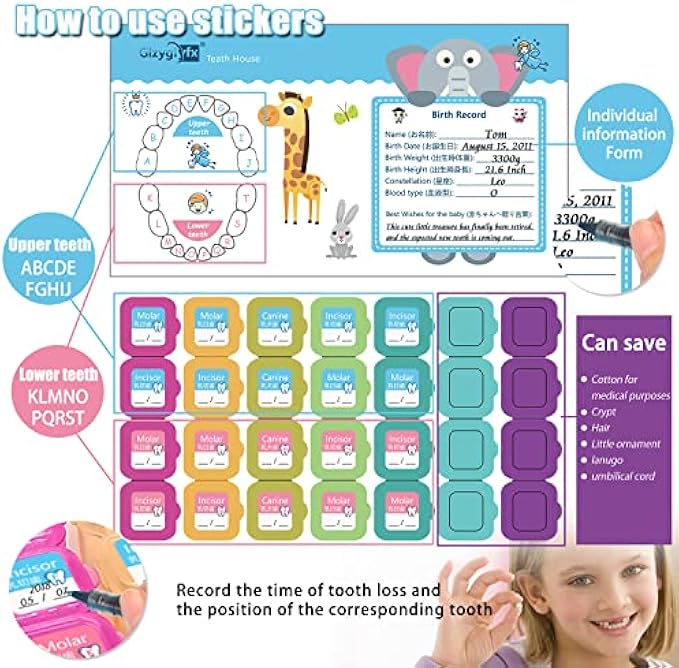 • 【INFORMATION RECORD】There are letters corresponding to the positions of the teeth on the cardboard and personal information is filled in on the right side. sticker above records the date the tooth was removed, Keep the Childhood Memory, very useful as a record of children's growth.